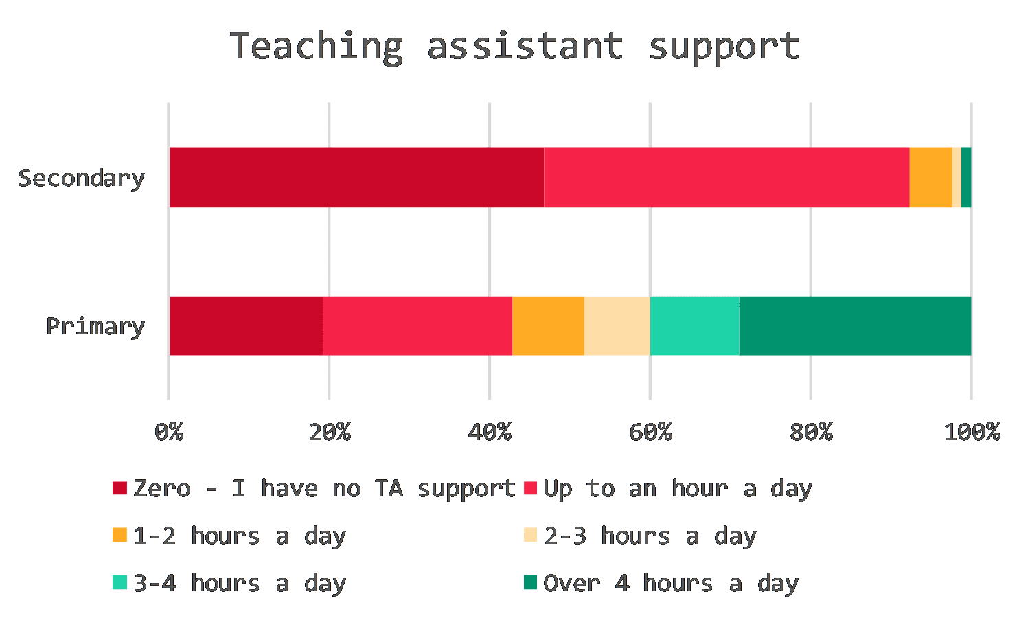 Life is quite different in secondary schools, where half our Teacher Tapp panel currently have no teaching assistant in any of their classes and the vast majority of the rest see one for just one lesson a day.