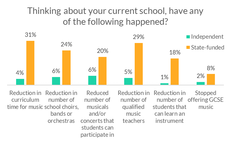 Whilst music education seems to be as strong as ever in the independent sector, those teaching in the state-funded sector are frequently reporting that provision has decreased in the past 5 years.