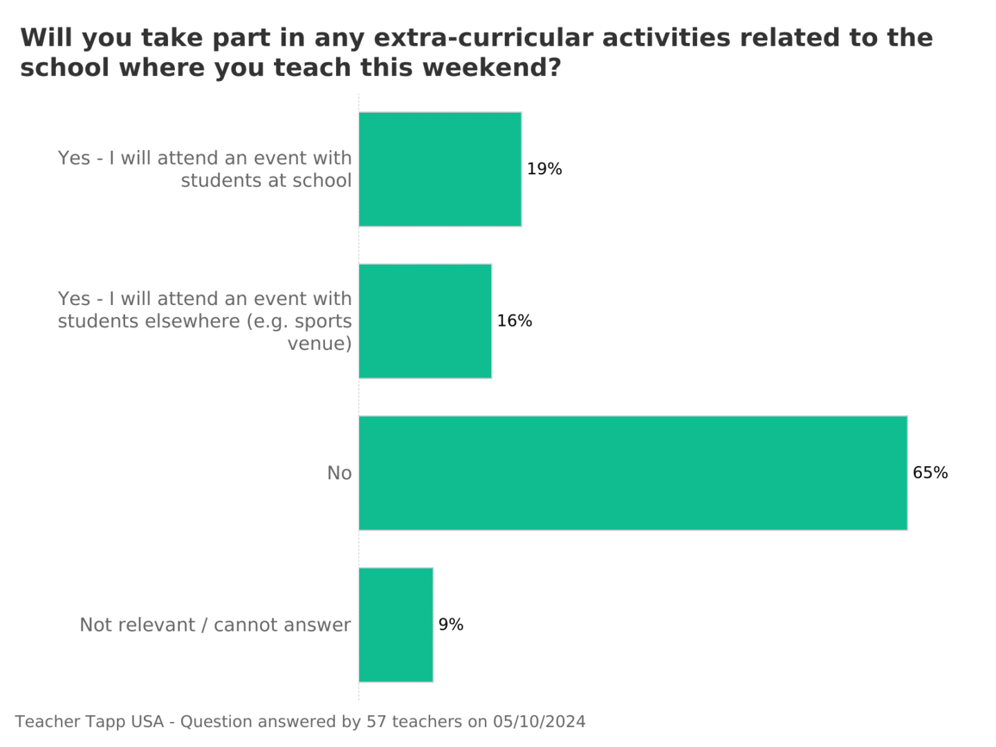 Many spend their weekends with students, whether in school or at other events. In fact, last weekend, 35% of teachers reported spending time with students over the weekend, with 19% in school and 16% at other venues, for example at a sporting event.