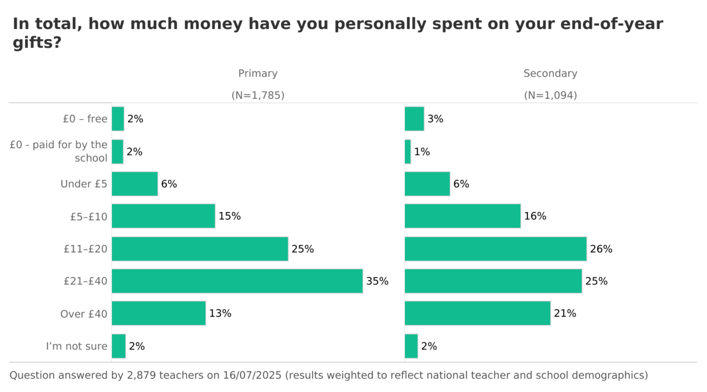 However – 21% of secondary teachers were spending more than £40 on their gifts, compared to 13% of primary teachers.