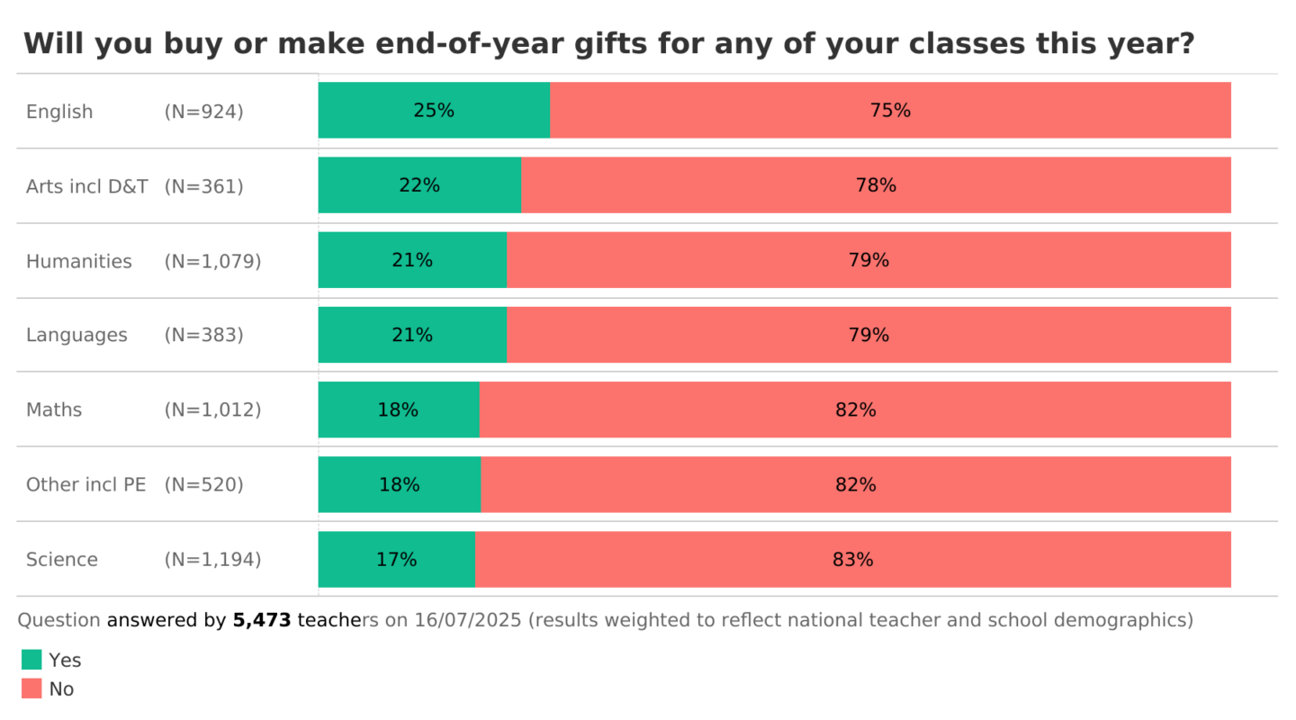 English teachers were the most likely to buy gifts (25%) and science teachers were the least likely (17%).