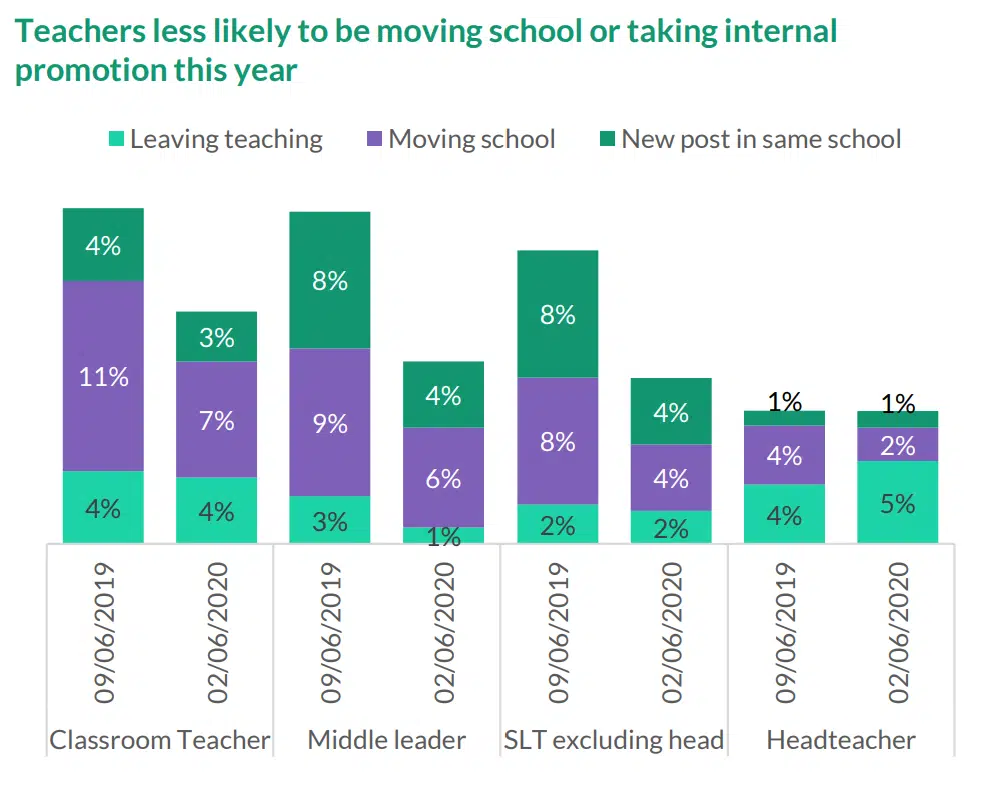 The impact of these reduced promotions and school moves might be positive in the short-term since they reduce disruption during these difficult times. However, they may have negative effects longer term. NQTs are struggling to enter the profession for the first time AND more teachers may look to move at Christmas or Easter which is very difficult for heads to manage.