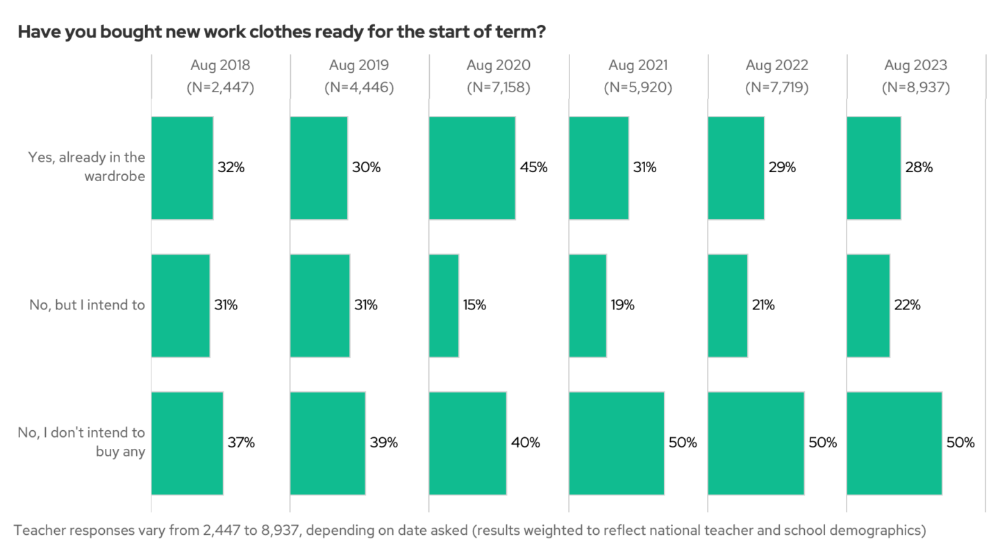 Since then the numbers have dropped and now just 28% of teachers bought new clothes and only 22% intended to – a much lower rate than in 2018.