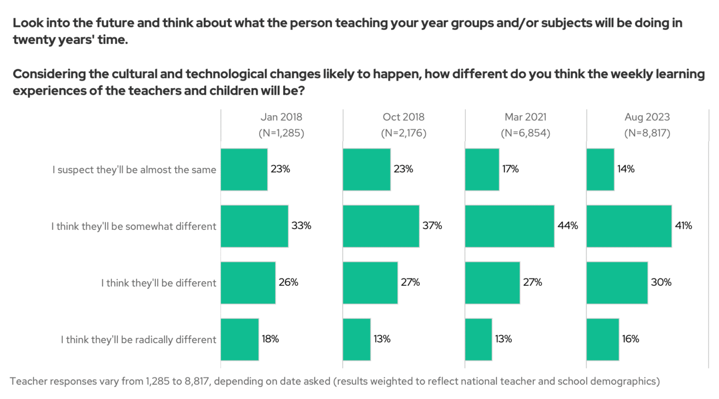 In 2018, when we asked you to imagine schools 20 years hence, 23% of you said they would be the same. Now, that number has dropped to just 14%.