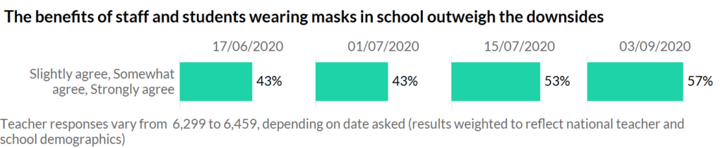 Teacher attitudes to mask-wearing have also changed a great deal. Back in June, 43% of you felt the benefits outweighed the downsides of wearing masks in schools, Now that’s shifted to 57%.