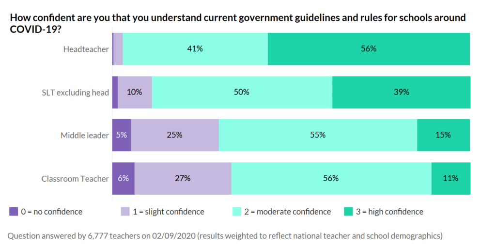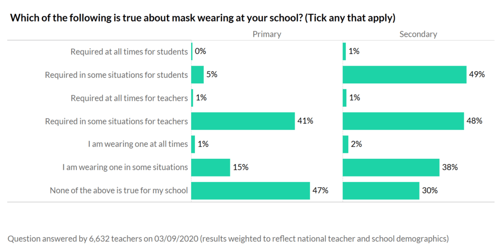 It is largely in secondary schools where mask-wearing is now taking place – almost half of secondaries are requiring students to wear them in certain situations and 4-in-10 secondary teachers say they will be wearing a mask at times. (Notice how many fewer teachers say that they will wear a mask themselves, given how many schools require it in certain circumstances. This suggests that teachers will actively choose to avoid communal areas, such as staffrooms as much as possible.)