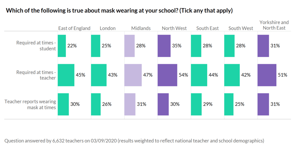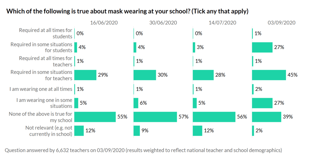 People are now expected to wear masks in most enclosed public spaces, yet schools have largely been excluded from this guidance. However, we have seen an increase in schools requiring masks to be worn. A quarter of schools are requiring students to wear masks in some circumstances and almost half are requiring teachers to wear them in particular places.