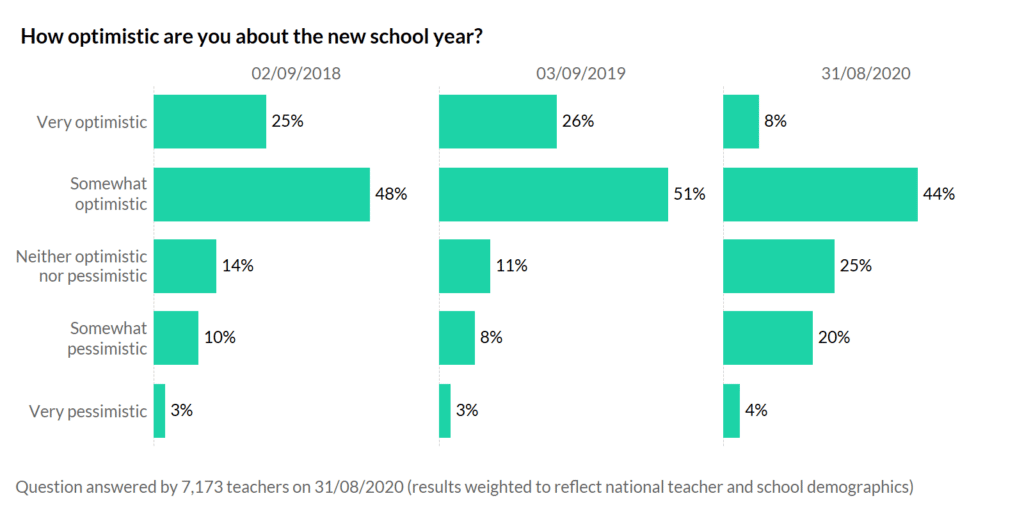 All students are now back in schools for the first time since March, but for how long? Teachers are usually an optimistic bunch, but this year there is much greater worry about the year ahead. A quarter of you are pessimistic about the coming year; in normal years this figure would be much lower.