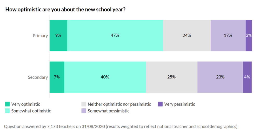 In a normal year there would be no difference in levels of optimism across school phases, but this year secondary teachers are more pessimistic. 27% of secondary teachers are pessimistic about this school year compared to 20% of primary teachers. This is understandable – their risk of COVID-19 is generally viewed as higher in secondaries thanks to larger bubbles, greater student and teacher movements around the school, plus the age of the students.