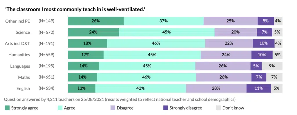 While Science and Arts teachers are more likely to have well-ventilated classrooms, Maths and English teachers were the least likely to do so – a particular issue when all students are required to do these subjects several times a week!