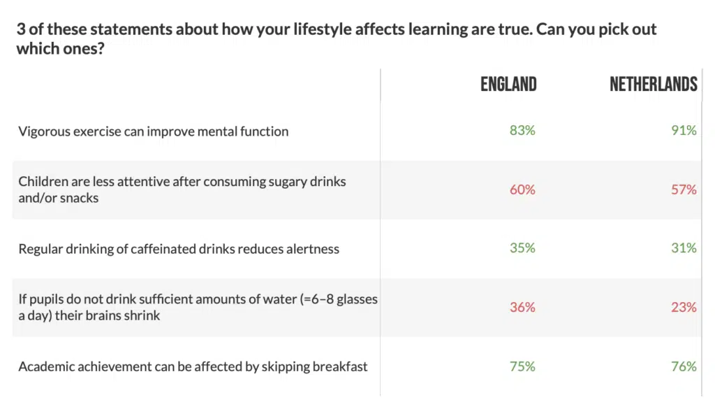 The first set of statements we asked about were about brain functions. Most teachers in both countries knew that mental rehearsal can change the shape of the brain and that the brain can take up other brain functions if parts are damaged. However, over 50% of respondents in both England and the Netherlands thought we only use 10% of our brain, and that’s not true!