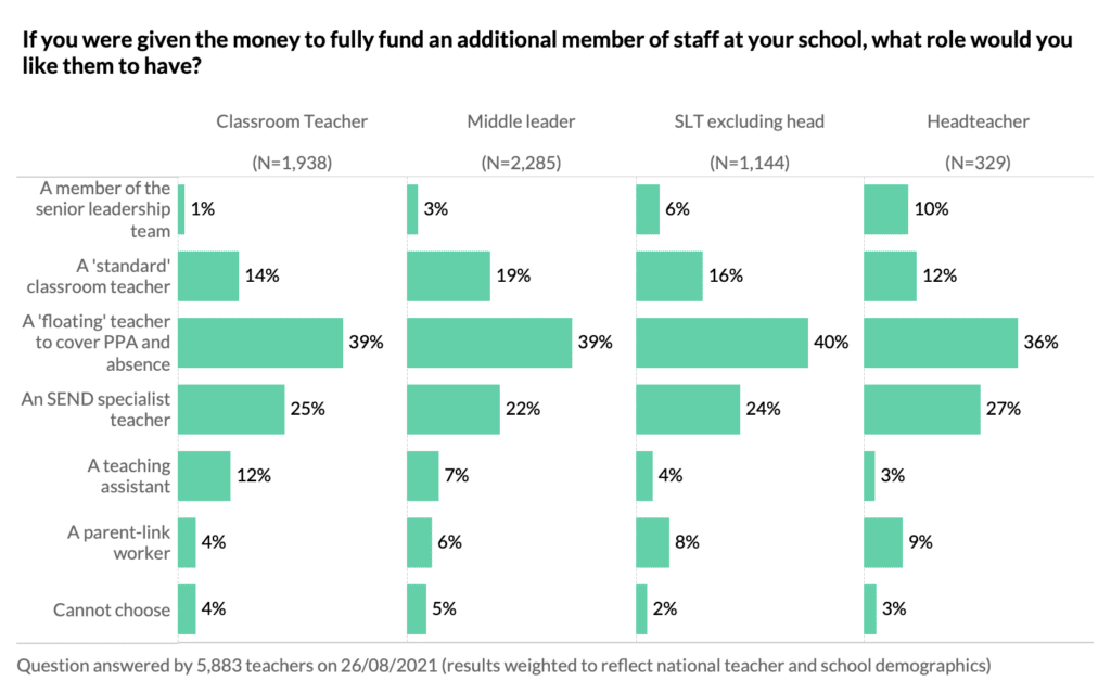 40% of you wanted be a ‘floating’ teacher to cover when needed (including PPA). 25% wanted a specialist SEND teacher to help support classes. These two were popular across all seniorities, but heads in particular were more keen on a parent-link worker and were less interested in teaching assistants. Could it be because the workload of dealing with parents more commonly falls to heads?!