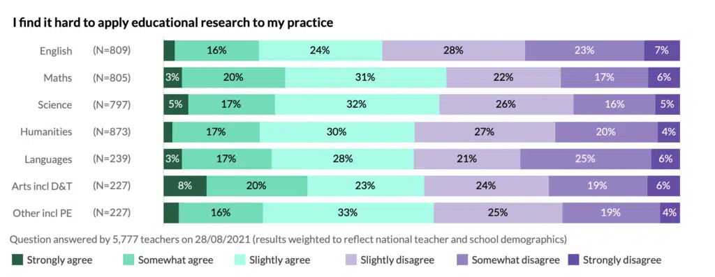 BUT more than half of you say that it’s difficult to apply the research you read about to the reality of classroom practice. Maths teachers were the most likely to say it was difficult to implement (54%). On the other hand, English teachers seemed to find it a little easier.