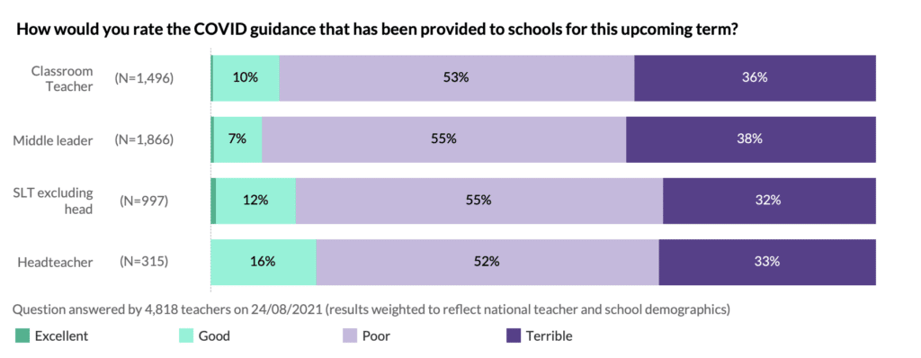One reason for the worries might be that 90% of you rated the current Covid guidance as Poor or Terrible. Headteachers were marginally more positive, with 16% of heads saying that the upcoming term’s Covid guidance is Good. Note: no headteachers in our sample said it has been Excellent.