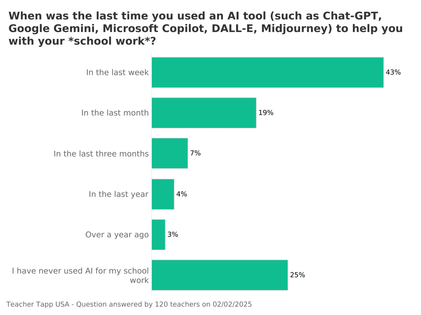 Quite a lot, in fact! 43% of teachers have used AI in the past week, while another 19% used it within the last month. A smaller group (7%) last used it more than three months ago. That suggests AI is something teachers either integrate into their routine or try once and move on.