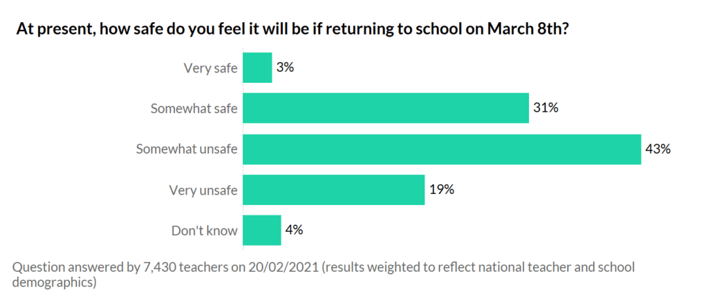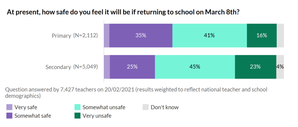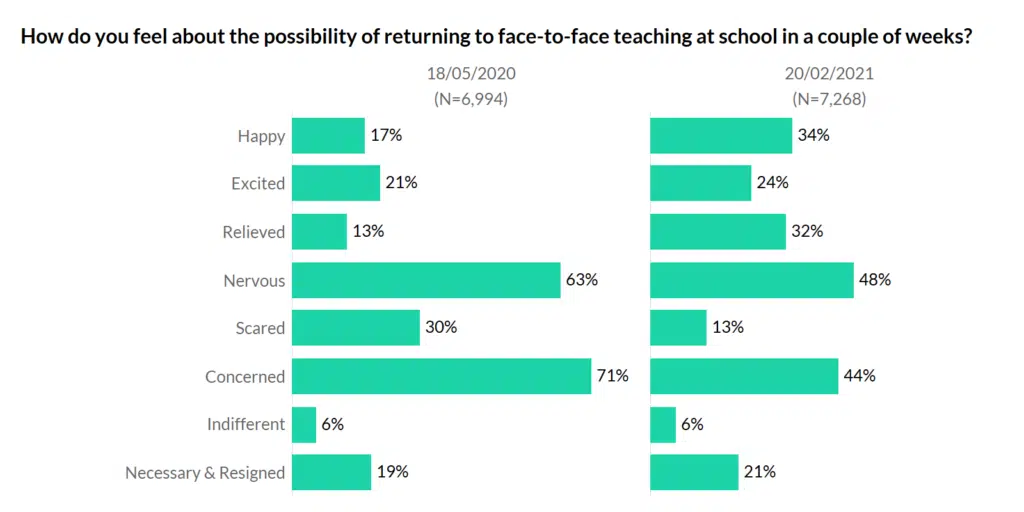 Nerves and concerns are also lower this time about a full return than last spring when some year groups in primary and secondary were confirmed as heading back to school in June. Having now done an autumn term of pandemic school, many fewer of you are scared of face-to-face teaching, but there is still a lot of nervousness.