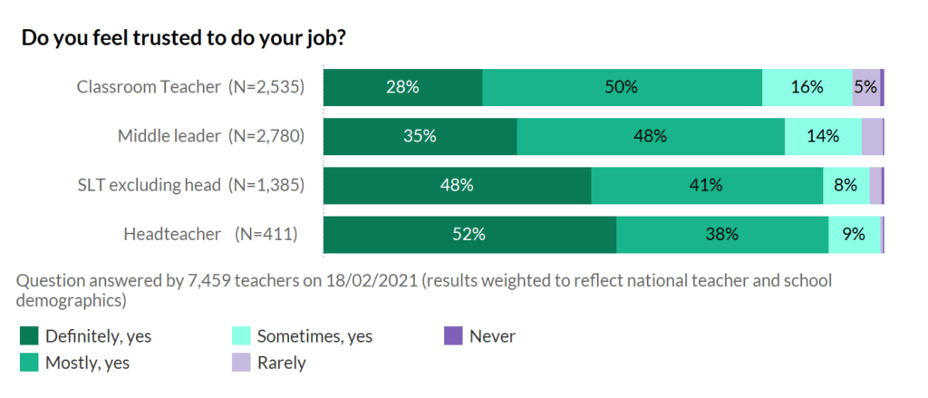 One reason for the difference might be that headteachers feel much more trusted with their job – with more than half saying they definitely feel that people trust them. AND heads are also the most satisfied with the level of responsibility they are given at work, even amid the pandemic madness!