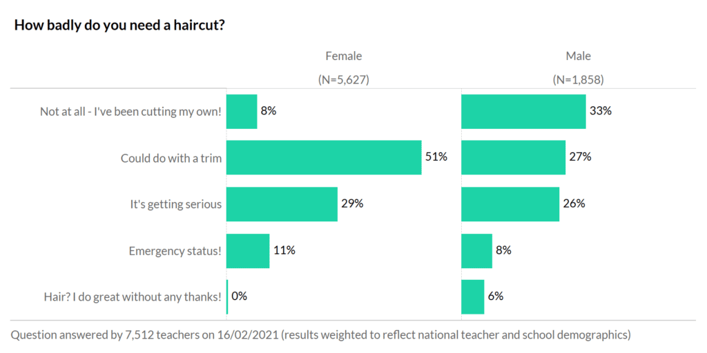 11% of women and 8% of men said their barnets are now at emergency status, with a further 29% and 26% behind in the ‘serious’ range. On the upside, if your hair is getting worse, just think how the pupils will be faring too! Bowl hair cut, anyone?