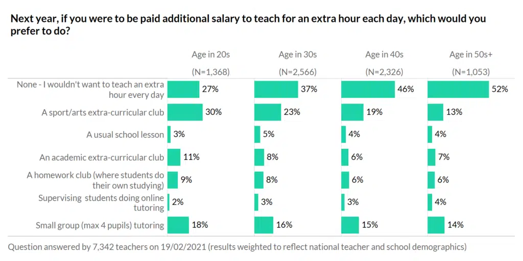 Sports and arts clubs were popular, but 18% of teachers in their 20s said they’d be happy to do small group tutoring. Even the more reluctant over-50s would take part in small tutoring, with 14% saying they would do it, if paid, after school.
