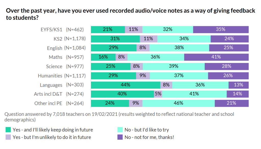 One of the early trends you flagged last year was a change in homework marking during the lockdown era. Several teachers mentioned a shift to voice notes as a more convenient, speedy, and personal way to give feedback. But how common is it?