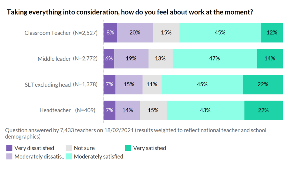 What does this mean for your overall feelings about work at the moment? By and large, you’re mainly satisfied, with senior leaders and headteachers again taking the lead in feeling the most satisfied. Back in the normal times, this was the usual pattern, so it’s somewhat comforting to see it coming back!