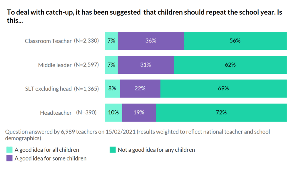 How will we make up for the time children have lost in school at various points over the past year? One idea was that children should repeat the school year. It was not, however, your idea – with the majority of you thinking it was not a good idea for any child. However, classroom teachers were more persuaded, with 36% feeling that it was a good idea for some children, perhaps.