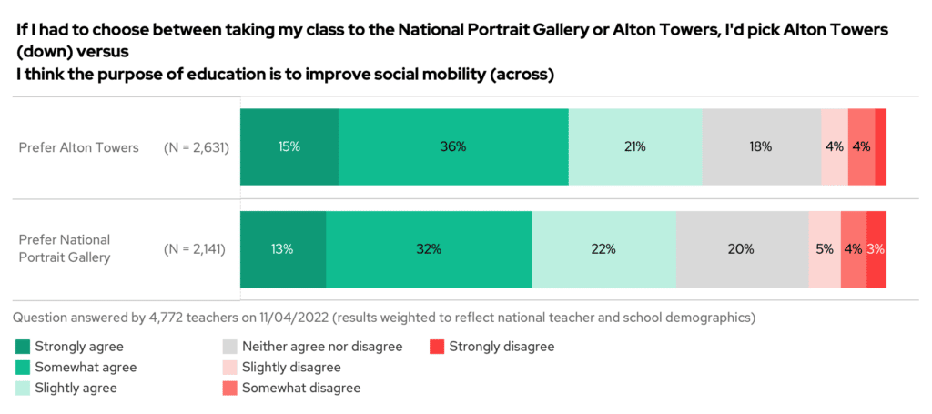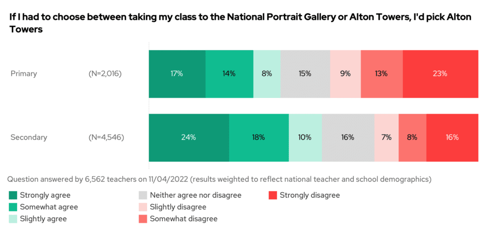 For a bit of fun, we asked if you’d pick taking your class to Alton Towers over the National Portrait Gallery. The results were fairly evenly split. Secondary teachers were more inclined towards Alton Towers, with primary teachers leaning more towards the National Portrait Gallery.