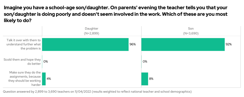 The results did vary by whether you were asked about a son or daughter, however. 4% of you would make sure your daughter would do their assignments compared to 8% when asked about your son. These may be very small differences, but the answers are significantly different, meaning that it’s not due to random chance that the differences arise.