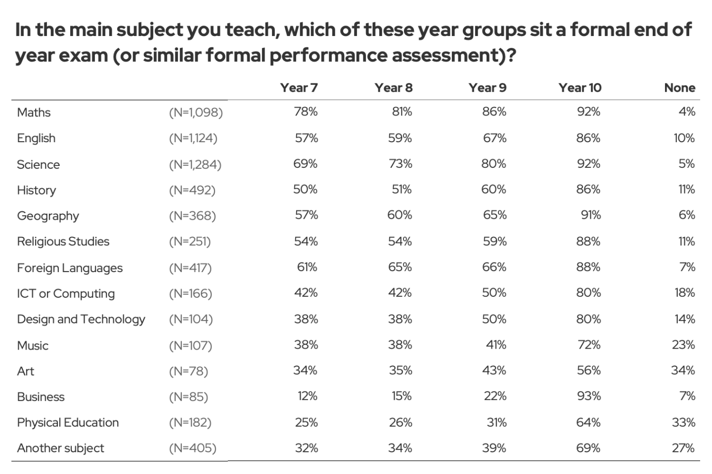 The organisation of assessments varies significantly by subject. Formal end-of-year exams are most common in Year 10 for core academic subjects, with around 90% of teachers reporting that their schools conduct these assessments. In younger year groups, the approach is more varied. For instance, between 50% and 60% of English and humanities teachers report holding end-of-Year 7 exams.