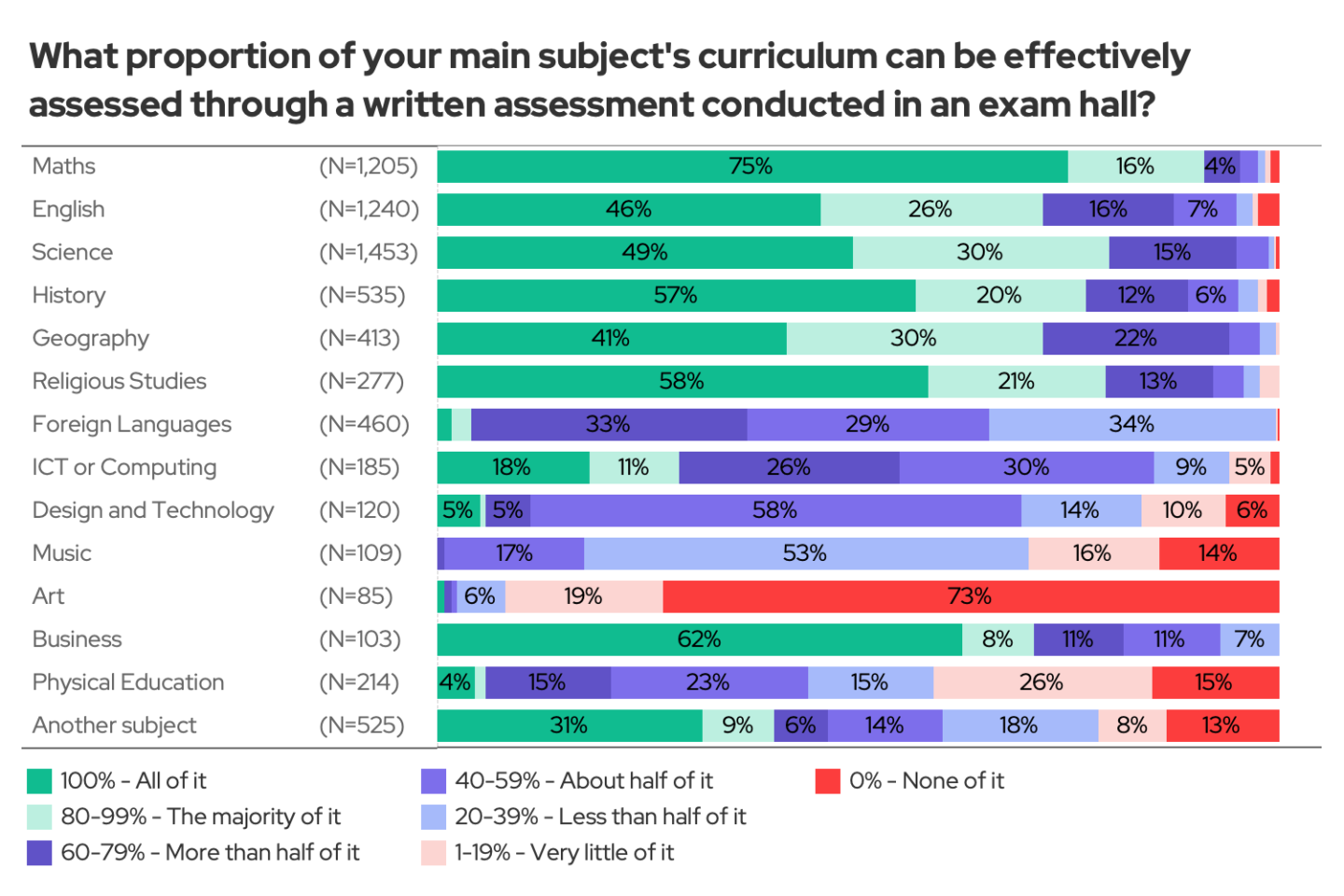 This variation in examination practices partly reflects differences in how well curriculum knowledge and skills can be assessed through written exams. While maths teachers generally believe their subject can be almost entirely evaluated in this way, teachers in most other subjects view written exams as an incomplete measure of student mastery. Subjects where written exams are perceived to be particularly misaligned with the curriculum include foreign languages, computing, design and technology, music, art, and physical education.
