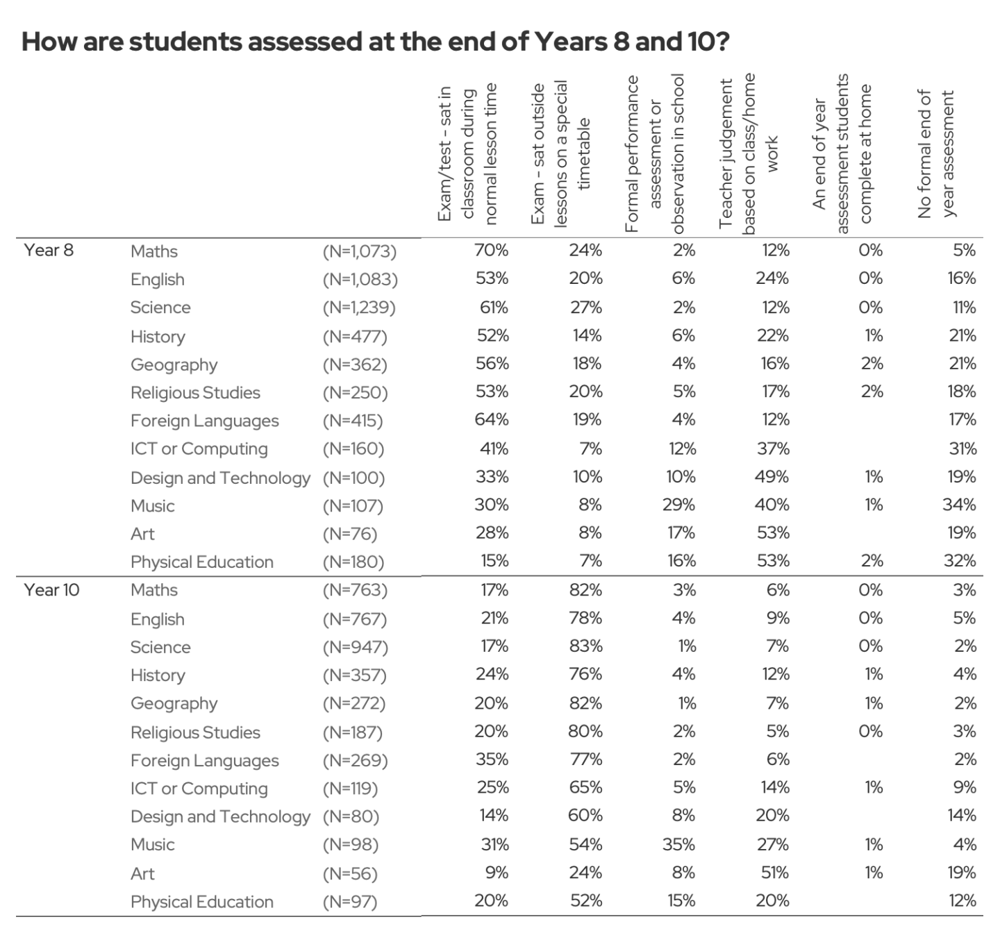 In smaller curriculum subjects, end-of-Year 10 exams are often held to prepare students for their GCSEs the following year. However, only about a third of teachers conduct formal exams in these subjects during Key Stage 3.