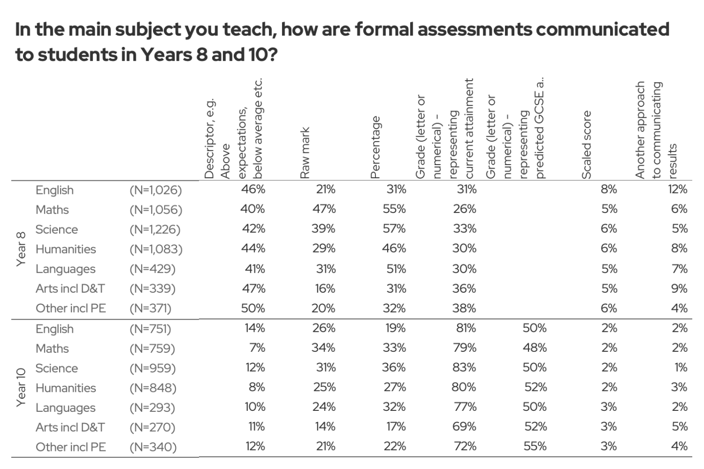 The communication of assessment performance varies by subject and evolves as students progress through school. By Year 10, most subjects report attainment using grades, with half of teachers also providing students with a predicted GCSE grade based on their assessment performance.