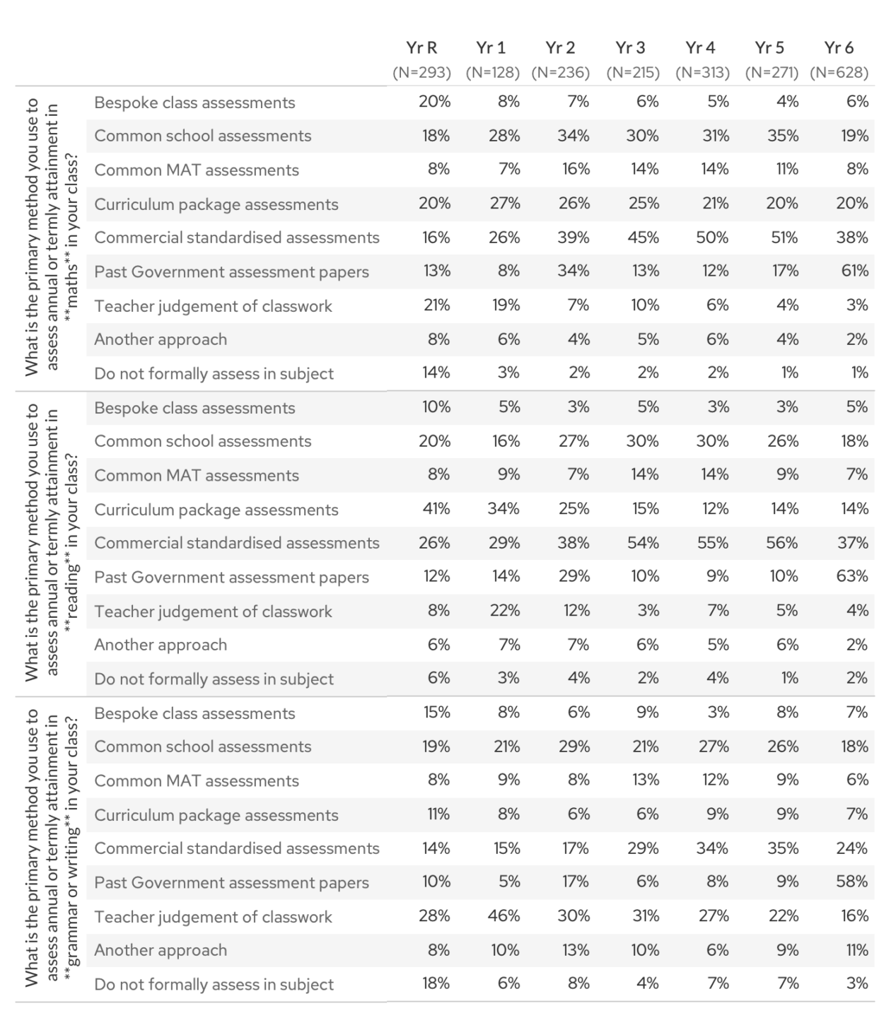 Beyond the core subjects of English and maths, external assessments are rarely used in primary schools. Even in science, fewer than 10% of teachers utilise a shared assessment.