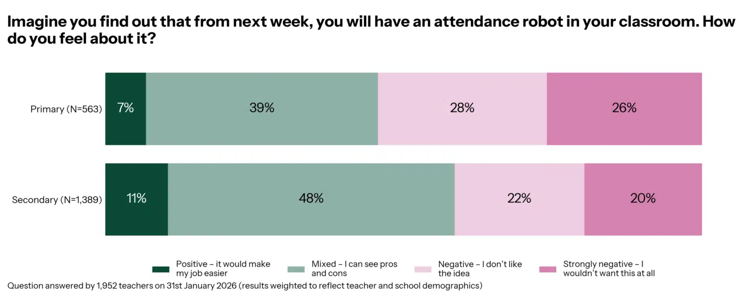 - More than half of primary teachers would feel negatively about the suggestion of an attendance robot (54%), and of those teachers, 26% of those wouldn’t want it at all. Feelings are slightly less anti in secondary, with 42% feeling negatively, of those, 20% wouldn’t want a robot in their class at all.