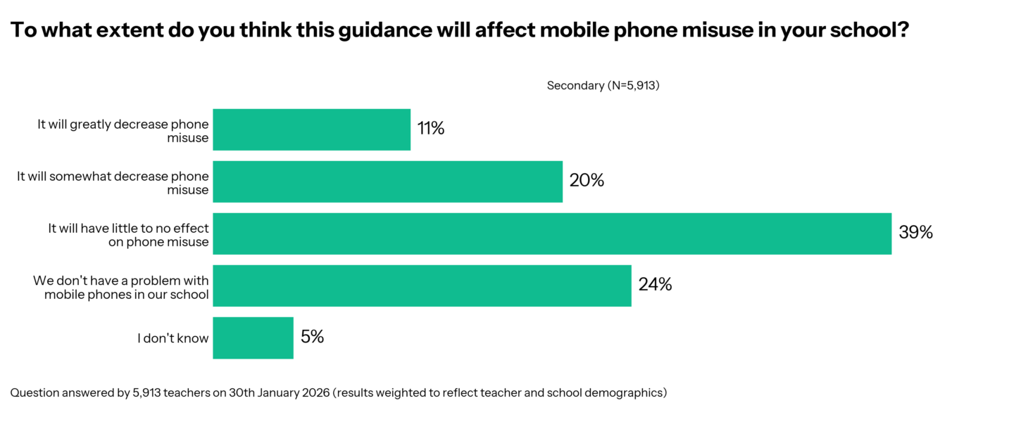 But how did this news go over with secondary teachers? Reassuringly, 31% thought the new guidance would reduce phone use in their school, and within that figure 11% feeling it would ‘greatly’ reduce phone use.