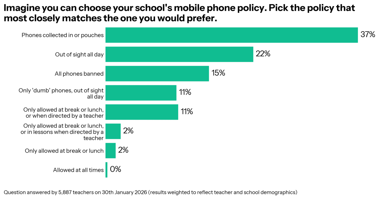 When it comes to the ideal policy, how popular is Phillipson’s suggestion that phones should be banned throughout the day? Pretty popular! 85% of teachers would choose a policy that would restrict phone use all day including break and lunch, with just 11% picking a policy that allowed them at break and lunch, plus when directed by a teacher, 2% at break and lunch plus in lessons if directed by a teacher, and 2% just allowed at break and lunch.
