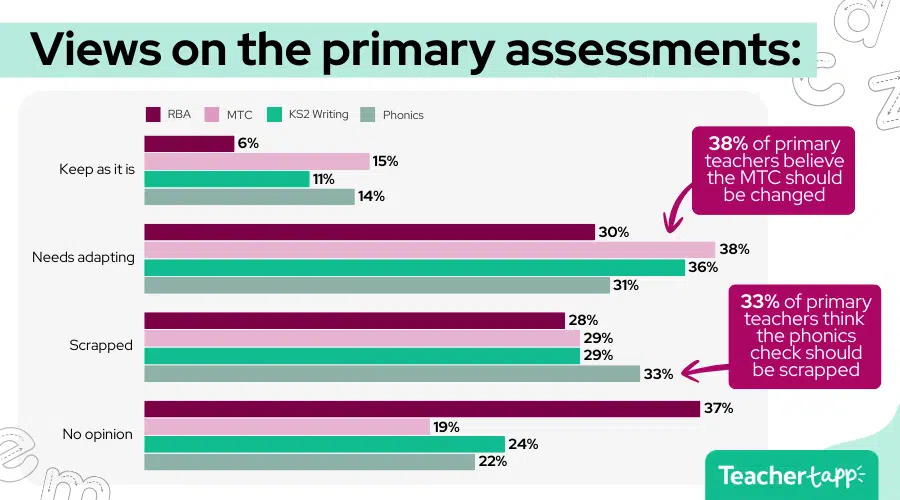 However, a third of teachers would scrap the phonics check altogether, compared to 29% who would scrap the MTC and KS2 Writing, and 28% who want to drop the RBA.