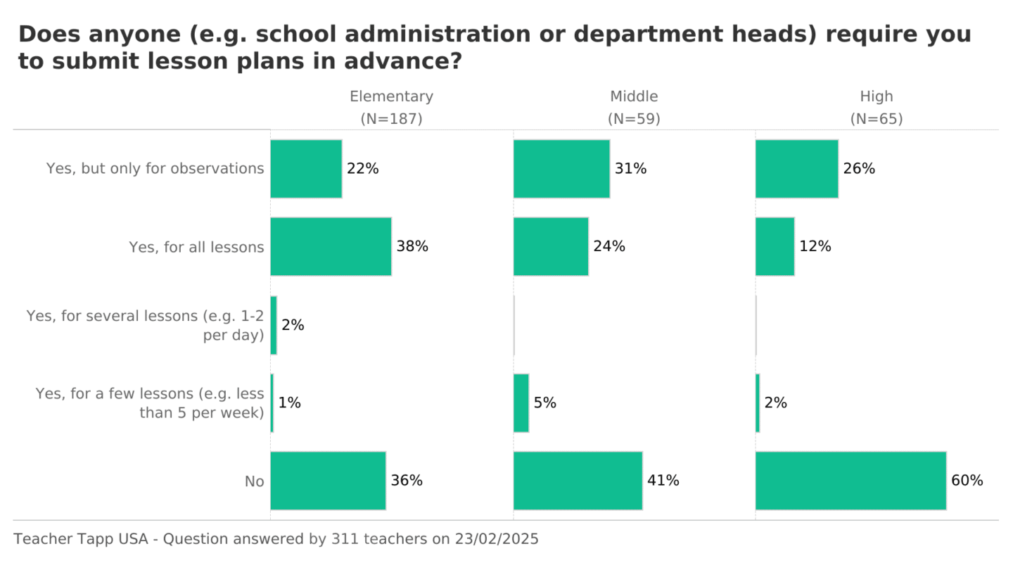 Elementary and middle school teachers are more likely to be turning in their lesson plans compared to high school teachers with 38% of elementary teachers, 24% of middle teachers and just 12% of high school teachers submitting their plans for every lesson.