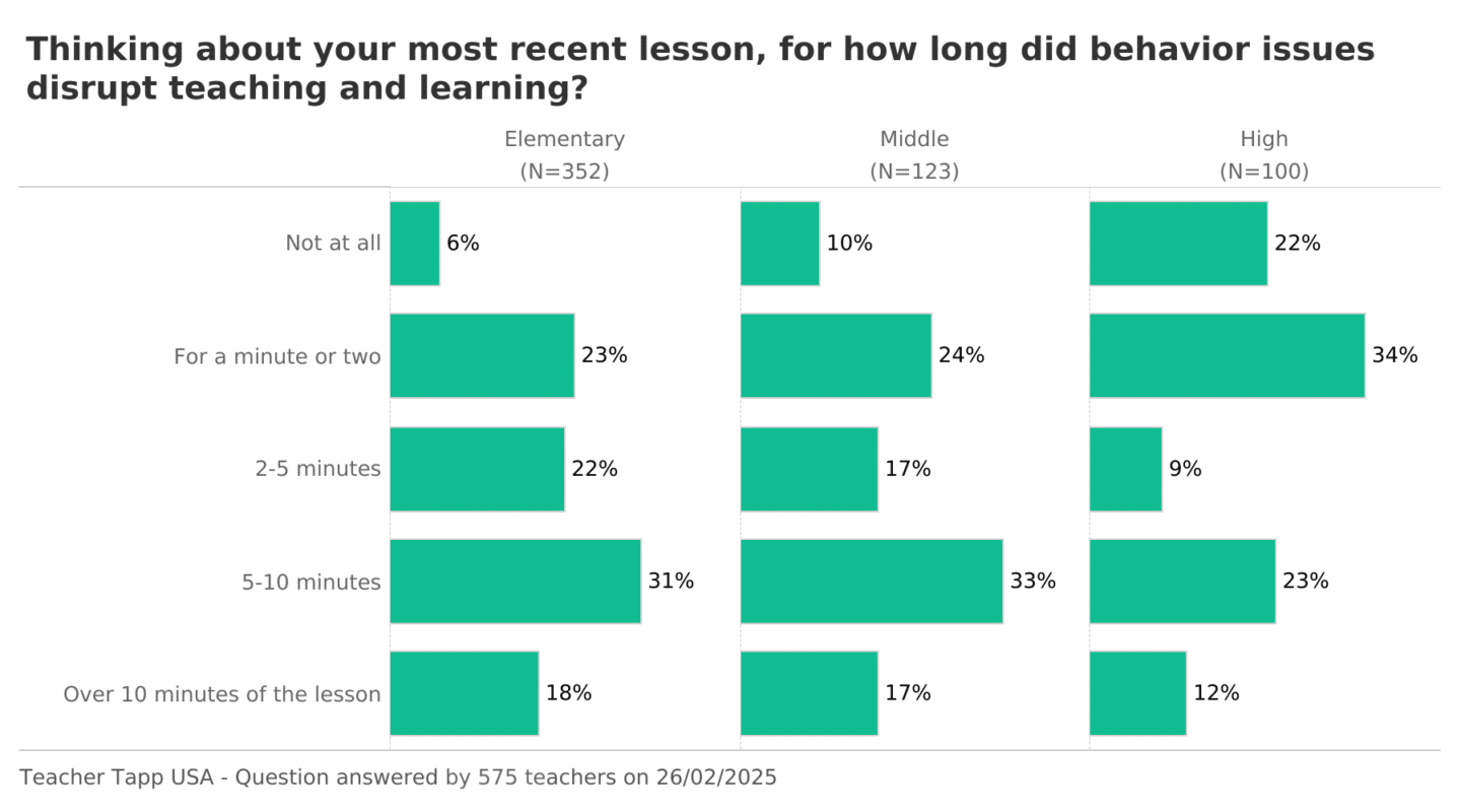 📌 High School: 78% report disruption; 35% say it lasts 5+ minutes.