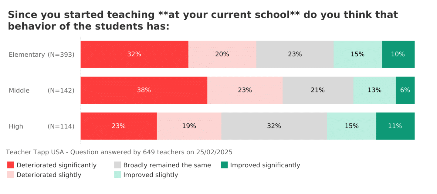 52% of elementary teachers say behaviour is worse today than it was compared to when they started teaching, and 61% of middle teachers feel the same. High school teachers were the least likely to say things were worse, with 42% noticing a worsening trend in behavior.