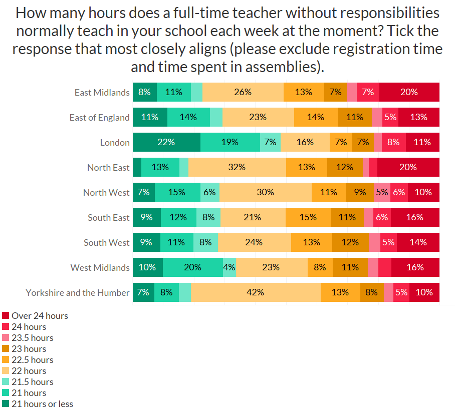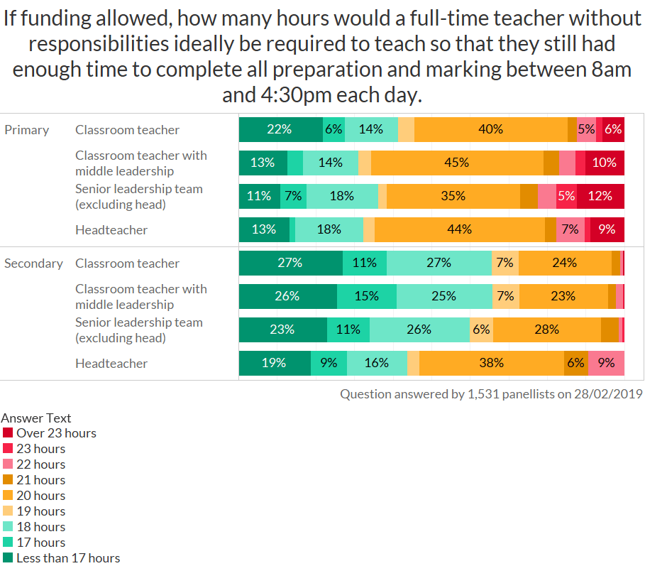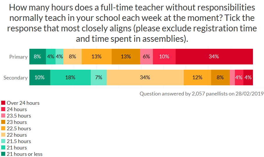 A Teacher Tapper wanted to know what the typical teaching hours burden looked like for a ‘normal’ classroom teacher. We feared it would be hard to get the right response by asking this way. In particular, primary teachers struggled. When does registration time stop and ‘lesson’ time start? Does walking to and from assembly count? For secondary teachers, the maths involved in converting non-hour-long lessons into hours was challenging for a few! We will ask about this again – but we need another idea about how to do it!