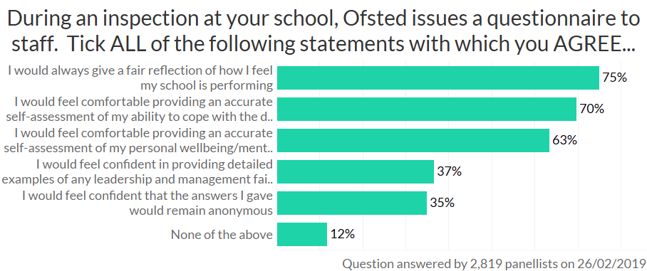 Ofsted’s Sean Harford was pretty happy to see that you claim you would be honest in a staff questionnaire at the time of inspection. But how you spin this statistics rather depends on what story you want to tell. 25% of teachers would not give a fair reflection of how they feel their school is performing! 63% would not feel confident in providing examples of leadership and management failings! Moreover, as some teachers on twitter pointed out, many of those saying they would be honest also work for schools where they are very happy. They aren’t claiming they would report problems, should they exist. We’ll think about asking another question on this…