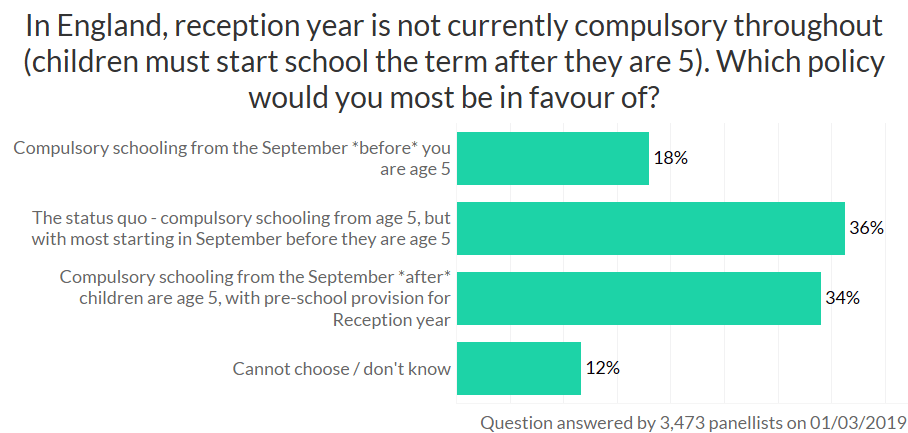 We are in the strange situation of having a curriculum that almost relies on 4 year-olds showing up at school in September, and yet legally they don’t have to be there until the term after they turn 5. There seems to be no consensus on whether this is something we should try to resolve. We thought primary and secondary teachers might have very different views, but it turns out they didn’t.