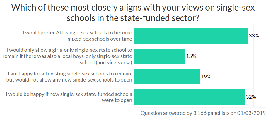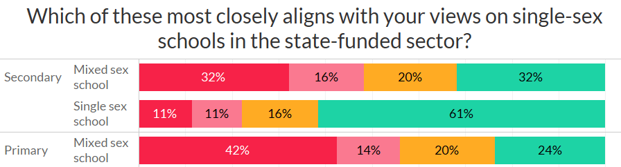 However, this is ANOTHER policy where there is no consensus among teachers about what they would like to see. Moreover, younger teachers are no more or less in favour of single sex schools that older teachers.