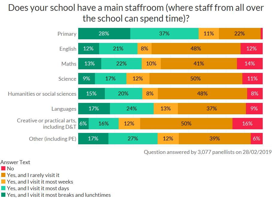 We guessed it would be the science teachers who would visit the main staffroom least as the need for a technicians’ room means it is harder to avoid giving them staff space in their department. But when we looked, it turned out it was the art and crafty types who are most likely to stay away.