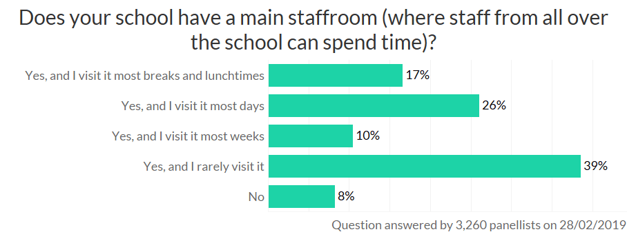 Most of the questions we asked this week came from Teacher Tappers and we made some interesting discoveries about you all. We were amazed to find out you mostly aren’t eating your biscuits in the main staffroom. In fact, many of you secondary teachers rarely visit it!