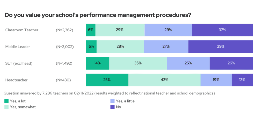 At Teacher Tapp Towers, we have an old and trusty friend: the gap between leaders’ and teachers’ perceptions. This week, we asked about performance management, and we were pleased to see our old friend reappear. Just six percent of classroom teachers and middle leaders value their school’s performance management procedures a lot. Conversely 37% of classroom teachers (and 39% of middle leaders) told us they didn’t value performance management at all.