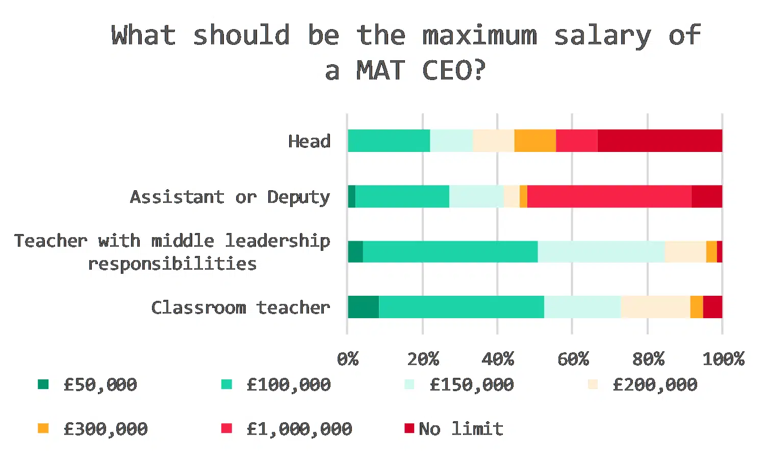 Classroom teachers and middle leaders typically selected a cap of £100,000 or under. Only a tiny proportion – 10% or less – felt a salary of £300,000 upwards was acceptable.