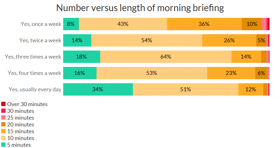 Where briefings are daily, they do at least tend to be short. Still, many of you are spend almost an hour a week just attending your morning briefings. Do you feel your morning briefings are essential?