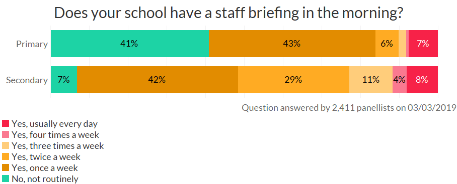 Did you have a staff briefing this morning? For about 8% of you, the answer is: ‘Yes, of course, we have them every day!’ Briefings are far more common in secondary schools, where the challenges of staff communication are greater. In primary schools, 41% of teachers don’t routinely take part in a briefing.